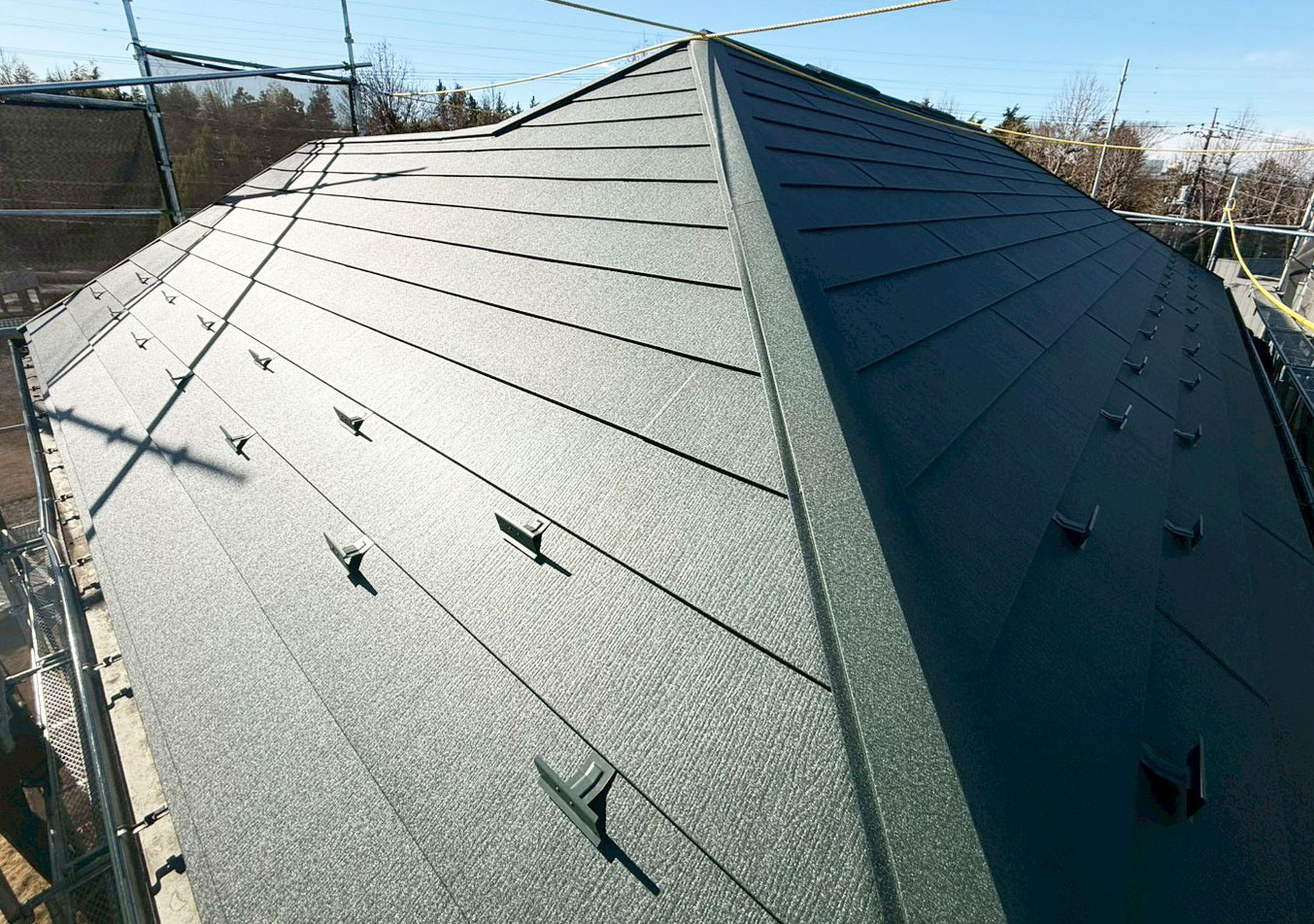 シックなブラックやブラウンから、アクセントになるブルーやワインレッドまで、豊富なカラーバリエーションをご用意。また、表面に施された特殊な「ちぢみ塗装」により、金属屋根でありながら単調にならない、立体的で高級感あふれる質感を表現しています。機能性だけでなく、優れた意匠性も持ち合わせた住まいを実現できます。