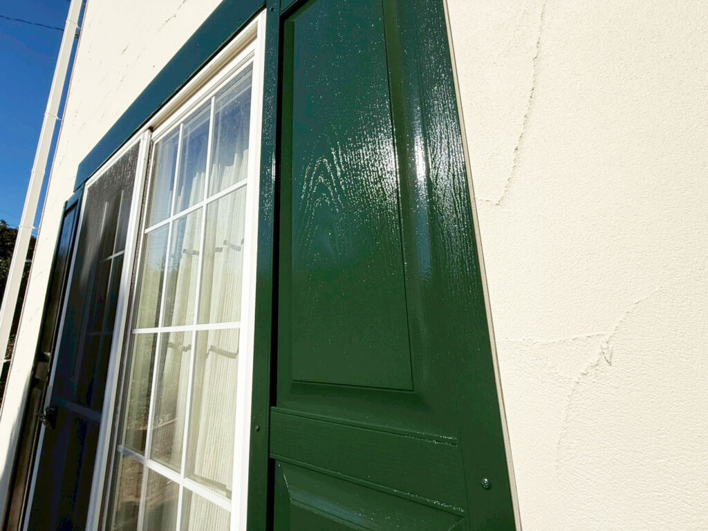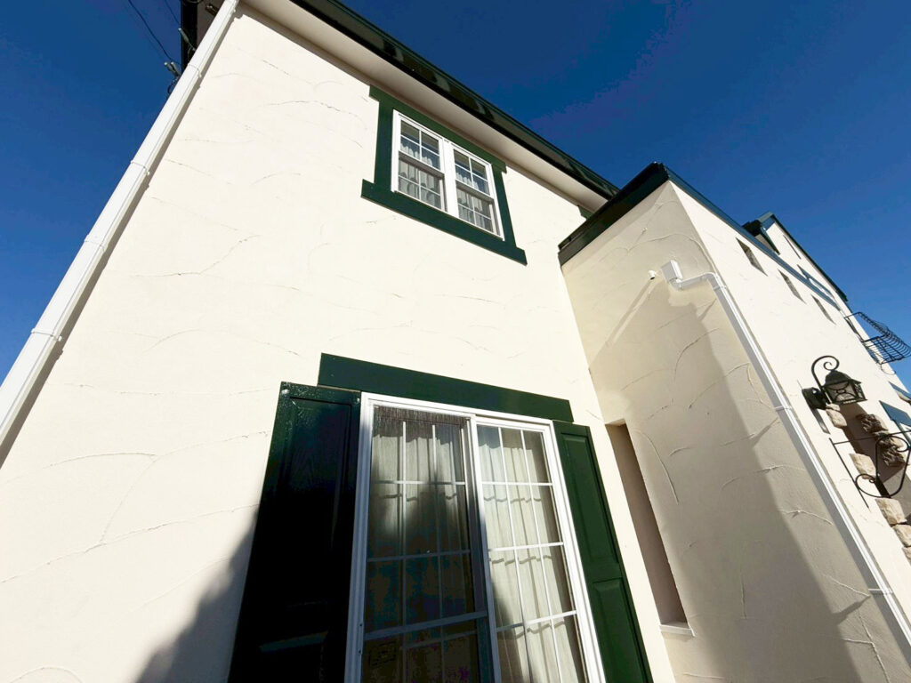 今回、外壁は元々のベージュカラーよりも明るめの色をお選びいただいて、付帯部は元々グリーンが使われていたので、今回はより濃いめのダークグリーンを選ばれました。