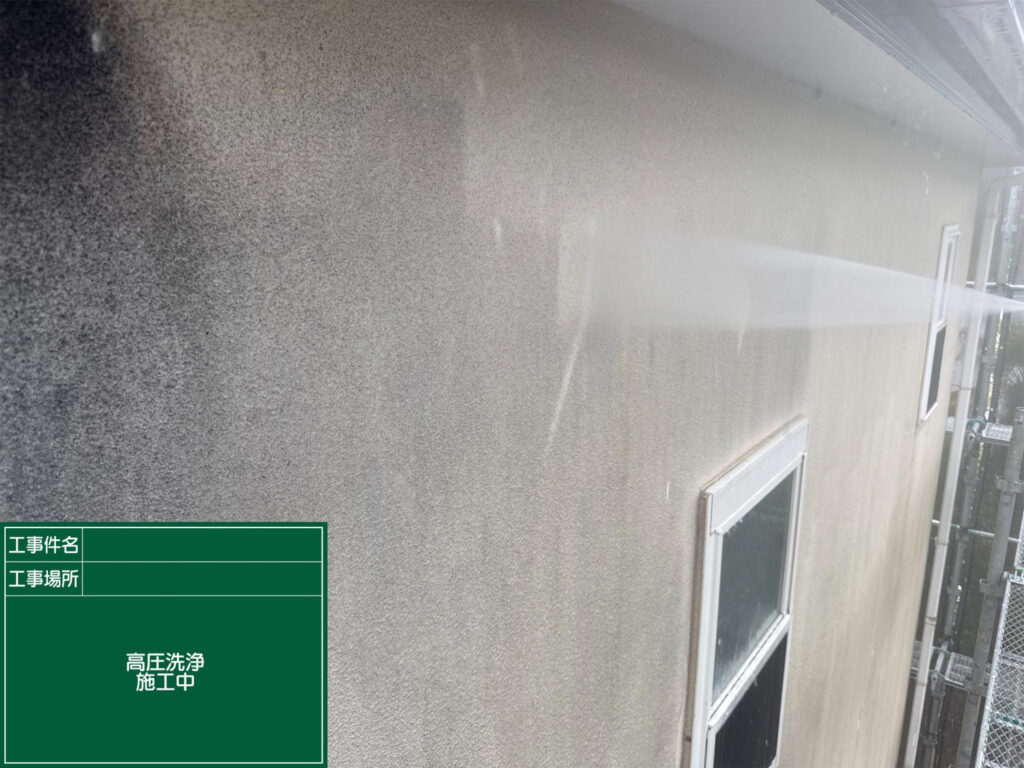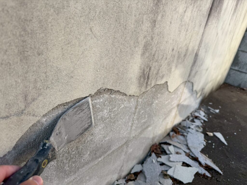 現場調査で外壁の汚れ具合から塗膜が剥がれて長い時間が経っていることが分かりました。そのため、外壁の表面の汚れが落ちずに蓄積するようになり、黒ずみやくすみができていました。